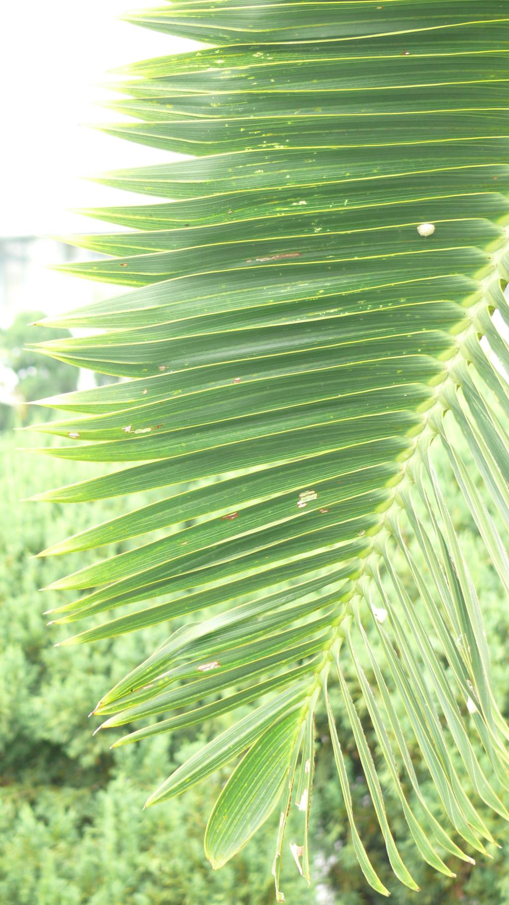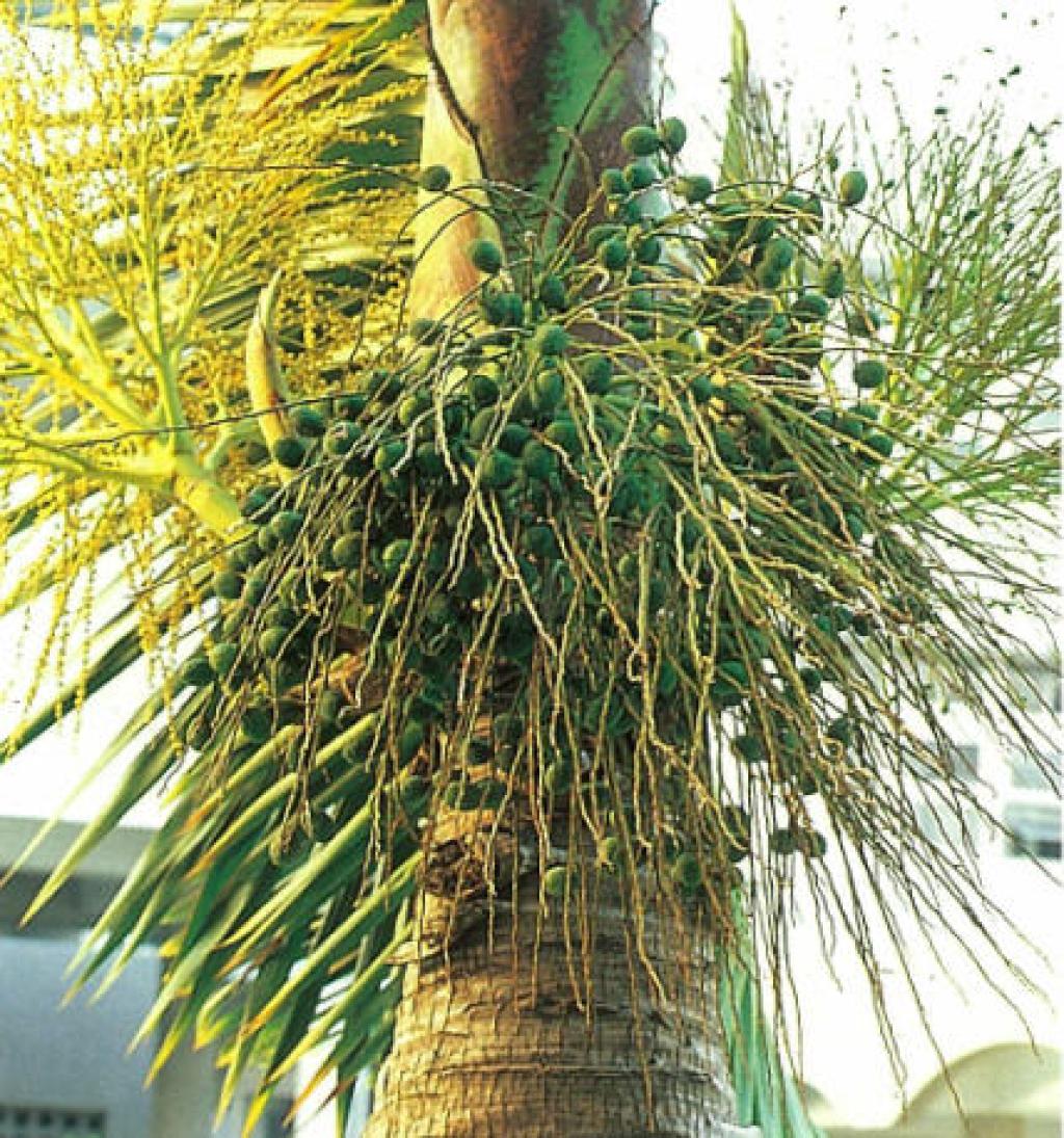 | 型態 | 常綠灌木狀棕櫚,幹單立,基部膨大,上部漸縮,全體呈酒瓶形,皮灰色,平滑,有細縱裂縫,環狀葉痕明顯。羽狀全裂葉,常5—7片簇生幹頂,輪廓呈闊橢圓形,橫斷面三稜形,表面突出,紅棕色;羽片無柄,條狀披針形,厚革質,表面綠黃至深綠色,背面顏色稍淡;中肋在表面凹下,於背面隆起,側脈沿中肋向上延伸,近平行。圓錐花序自假莖下抽生,1株上常有1—7個花序,每序有6—9枚佛焰苞,著生於花梗基部,黃綠色;序軸和花梗均綠色,光滑無毛,基部略膨大;雌雄同株,雄花密集於小穗軸上,排成1列,花小,三稜形,黃白色;雄蕊6枚,黃色,縱裂,卵圓形,子房蒼綠色至橙黃色;雌蕊著生於小穗軸上部,每隔5—7朵雄花有1朵;花萼3枚,綠色,闊卵形,金黃色,子房圓錐形上半部是金黃色,基部是綠色,花柱3枚,上有溝槽。核果橢圓形至圓球形,成熟時黃色,並散布白點,種子橢圓形,黃褐色。 |