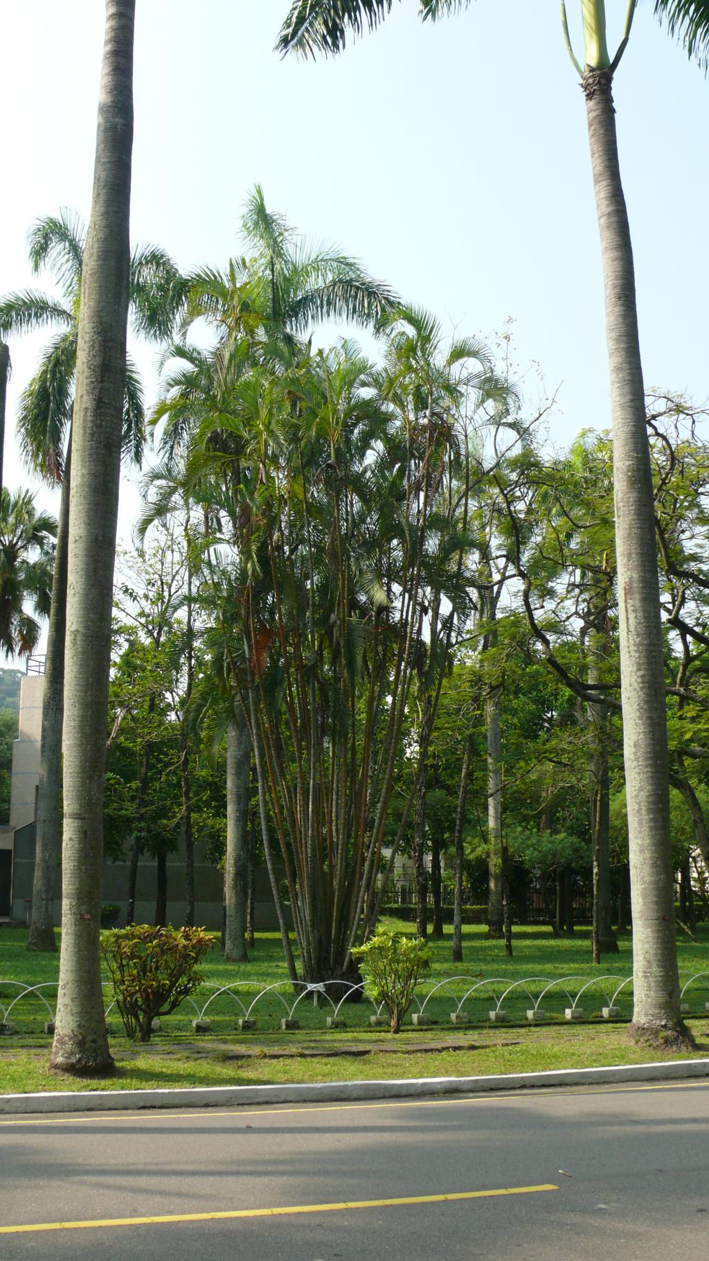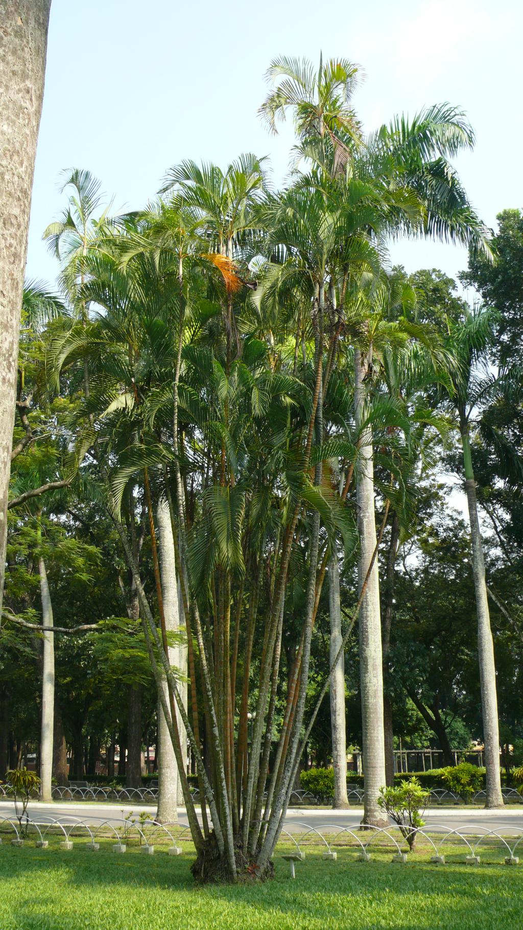 | 型態 | 常綠叢生灌木狀棕櫚,高2-5公尺,莖粗5-15公分,綠至黃色,基部略膨大,環狀葉痕明顯。羽狀全裂葉,互生而叢集枝頂,柄及葉軸光滑,黃綠色,上面具溝槽,背面凸圓;葉鞘長而略膨大,互抱於莖頂呈假莖狀,通常黃綠色,初被蠟質白粉,有縱向溝紋。聚繖狀圓錐花序生於葉鞘下;花小,單性,雌雄同株,卵球形,金黃色,螺旋狀著生於小穗軸上;雄花萼片和花瓣各3枚,上面具條紋脈,雄蕊6枚,花藥多少丁字著生。核果略呈陀螺形和倒卵狀,成熟時呈土黃色,外果皮光滑,中果皮具網狀纖維。種子略呈倒卵形,胚乳均勻,中央有狹長空腔。 |