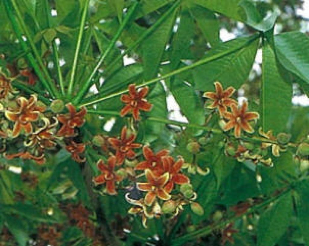 | 型態 | 落葉大喬木,高可達30公尺,樹幹直,多分枝,小枝輪生狀,水平伸展;樹皮灰色或灰褐色,具樹脂。掌狀複葉,互生,圓柱形,光滑無毛;托葉劍狀;葉片厚紙質至薄革質,橢圓狀披針形,先端漸尖或短尾狀漸尖,基部鈍;中肋明顯,側脈多數,互生,在近葉緣處相互連結。圓錐花序頂生,多與新葉同時長出,多分枝,水平伸展,花樹多,開花時帶臭味;單性或雜性,同株;苞片細小,光滑無毛;花萼鐘形,紅紫色;無花瓣;雄花花藥12—15枚,成頭狀聚生於蕊柱先端;雌花子房由5枚心皮組成,花柱彎曲,柱頭5裂,全體被絨毛。蓇葵果木質,船狀橢圓形,頂端急尖如喙狀,初呈黃綠色,後轉紅至橘紅色,乾後呈黑褐色而開裂。種子卵形至長橢圓形,黑色或紫黑色,有光澤。 |