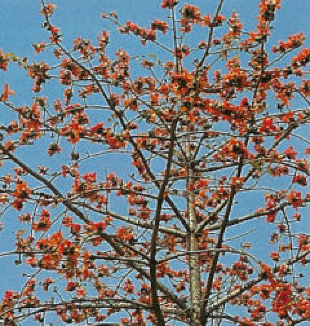 | 型態 | 落葉大喬木,高可達30公尺或超過,胸高直徑40-60公分,樹幹通直;樹皮灰白色,幼時常具圓錐狀粗刺,多分枝,側枝輪生,小枝粗壯,水平伸展,光滑無毛。掌狀複葉,互生;葉片紙質,長橢圓形至卵狀長橢圓形。花多先葉開放,單葉於葉腋,艷紅色或橘紅色;花梗粗壯,帶褐色;花萼杯形,亦呈褐色,裂片卵狀,先端鈍;花瓣5枚,倒卵形;外輪集成5束,每束有花絲10枚以上。蒴果橢圓形,密被灰白色長柔毛和星狀柔毛,5瓣裂,瓣片木質。種子數多,卵圓形,黑褐色,無胚乳,鑲嵌於絲質纖維內。 |
