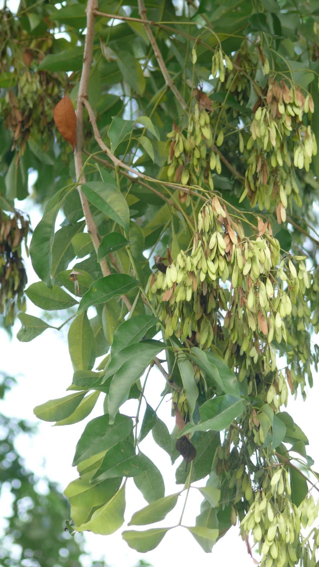 | 型態 | 半落葉大喬木,高可達30-40公尺,胸高直徑60-70公分;樹幹通直,樹皮原為灰白色,粗糙,呈薄片狀剝落,後轉呈紅褐色或灰綠色;小枝棕色,少數呈灰白色,被細短柔毛或無毛,具疣點狀凸起皮孔。奇數羽狀複葉,對生,葉片薄革質,卵形至長卵形。 圓錐花序頂生於當年生枝梢,多花;葉狀苞片匙狀線形,初時被細柔毛,花序梗圓柱形;花萼杯狀;花冠白色,深4裂,裂片橢圓形,花藥大,2室,球形,長於花絲。翅果闊披針狀匙形,鈍頭,翅下延至堅果中部以下,堅果圓柱形;種子有休眠性。 |