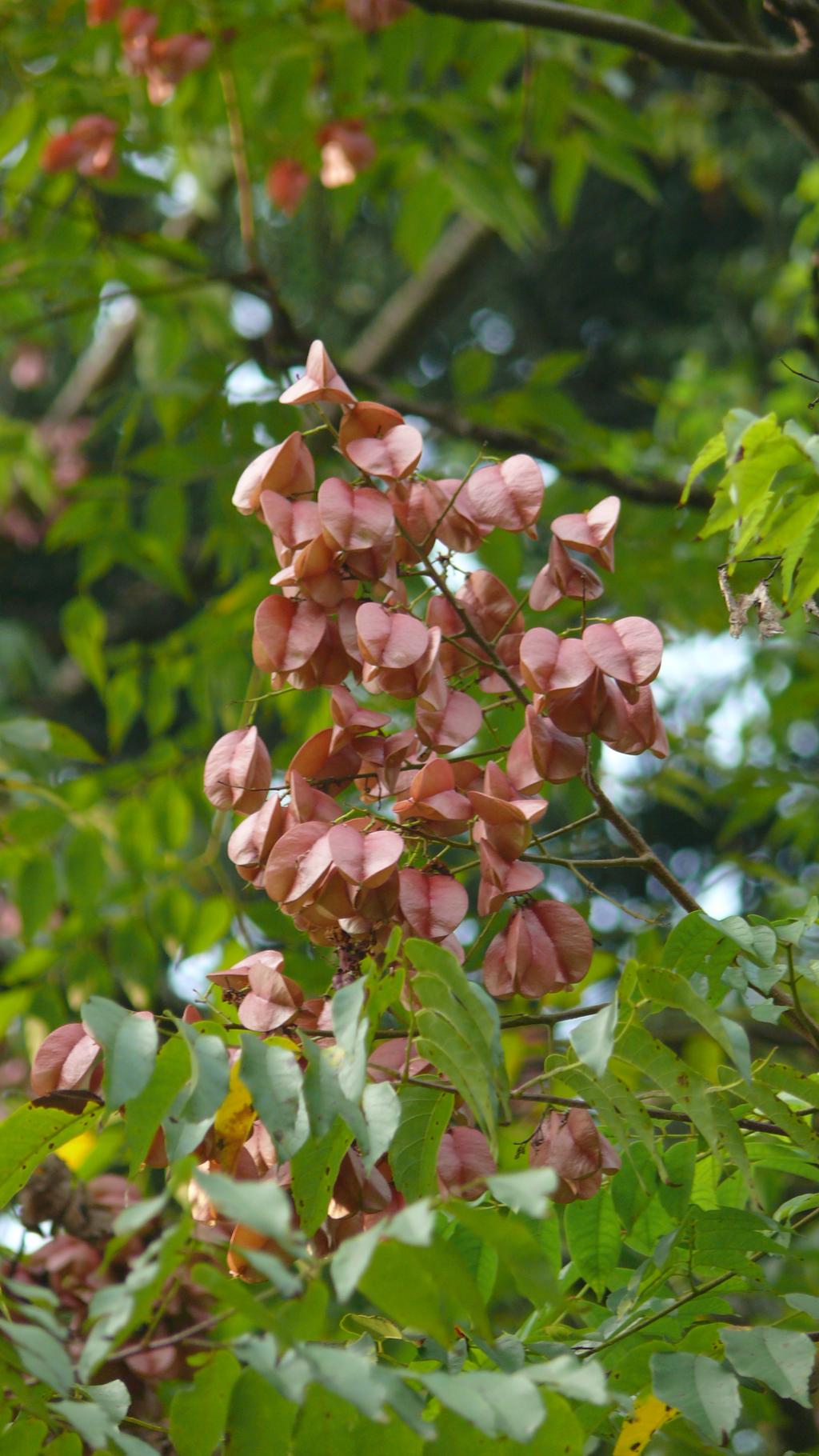 型態 | 落葉喬木,高可達20公尺,胸高直徑20-45公分;樹幹直,樹皮灰褐色;光滑,小枝具稜,被短柔毛。二回羽狀複葉,互生,羽片7-9枚,每1羽片有小葉10-13枚,對生或近對生;葉片紙質,長橢圓狀卵形,長5-7公分,寬2.5-3公分,形狀及大小常有變異,先端銳尖,基部鈍而歪,邊緣有鋸齒,表面暗綠有光澤,背面淡綠色,兩面均光滑無毛;中肋於表面凹下而於背面顯著隆起,側脈10-12對,表面不顯著而於背面隆起。花小形,數多,開放時黃色;單性,雌雄同株或雜性花多數;花瓣5片,披針形或卵狀披針形,瓣爪被毛,內側基部有2裂、頂端具疣狀小齒鱗片。萌果膨脹,粉紅或紅色,橢圓形,具3稜,果瓣近圓形,外面具網狀脈紋,內面有光澤。種子球形。 |