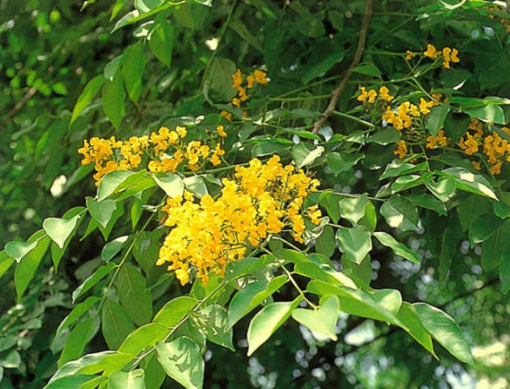 | 型態 | 落葉大喬木,高15-25公尺,胸高直徑可達40公分,樹幹通直,樹皮灰褐色,枝條斜上昇,多數,光滑無毛。奇數羽狀複葉,互生,柄長3-5公分,基部略膨大,托葉早落;全葉輪廓呈長橢圓形。總狀花序或圓錐花序頂生或腋生,長15-25公分,密被褐色細柔毛;花多,梗長0.6-0.7公分,苞片2枚,對生,線形,早落;花萼鐘狀,微彎;花冠黃色,花瓣有長柄,邊緣皺波狀,旗瓣寬1-1.3公分,翼瓣寬1-1.2公分;雄蕊10枚,先呈單體,後轉為二體;雌蕊子房具短柄,密被柔毛,莢果圓形,扁平,偏斜,寬約5公分,種子部分略被毛且有網紋,周圍具1-2公分寬翼,內含種子1-2粒。種子千粒重500-700公克,每公斤有1,660-2,000粒種子。 |