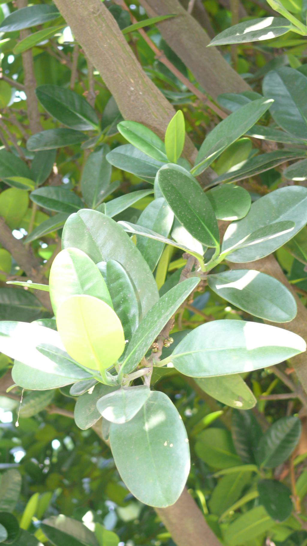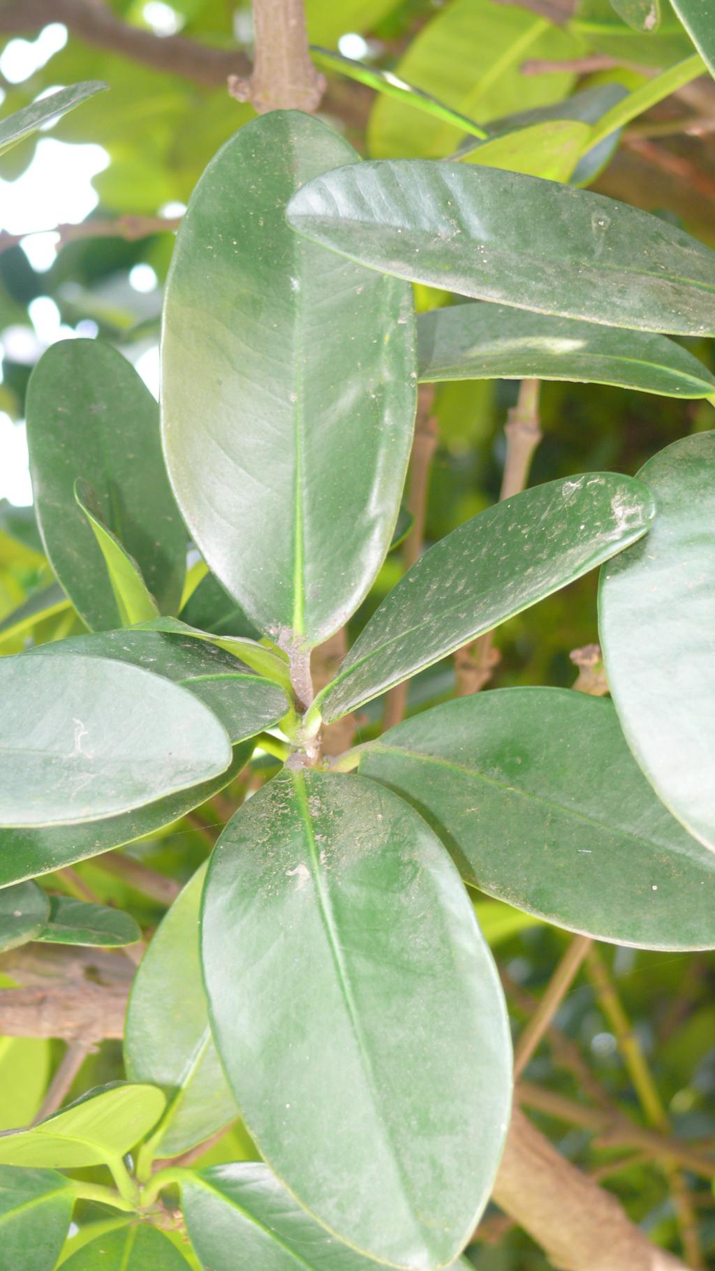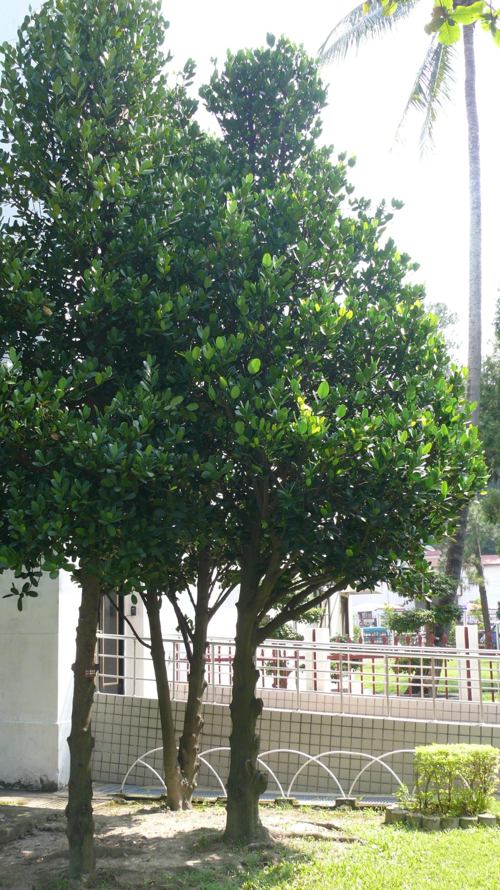 | 型態 | 常綠喬木,高可達20餘公尺,胸高直徑20-30公分,樹幹粗壯,樹皮帶黑色,具乳汁。單葉,對生,柄粗壯,有稜角及柔毛;葉片厚革質,卵形,卵狀橢圓形或橢圓形,先端鈍而微凹,基部寬楔形至近圓形;表面暗綠色有光澤,背面黃綠色,兩面均光滑無毛,全緣而略向背面反卷。花雜性,同株,多叢生於葉腋或無葉枝條上;雄花和雌花常混生,有時雌花成簇生狀,雄花呈假穗狀;雄花萼片5枚,近圓形,革質,邊緣密生短睫毛,內方2枚較大,外方3枚較小;雌花通常具長梗,花被和雄花相似。 |