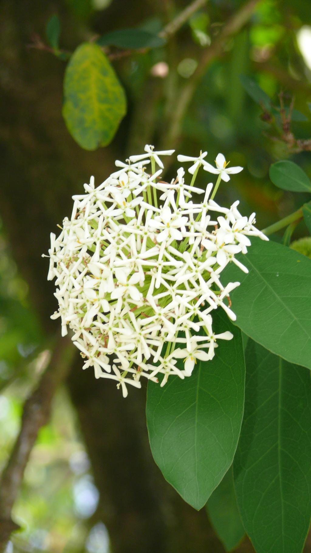| 型態 | 常綠灌木至小喬木,高可達5公尺,樹皮淡褐色;多分枝,小枝直立或斜上昇,圓柱形,光滑無毛。單葉,對生,托葉2枚,基部合生,先端三角形銳尖;柄粗壯,光滑無毛;葉片革質,橢圓形或長橢圓形,先端鈍,基部楔形;全緣,表面綠色有光澤,背面淡綠色,兩面均光滑無毛;中肋於表面略凹下而於背面顯著隆起,細脈不明顯。聚繖花序頂生,總梗常分生3-5對短花軸,各著生多數花,集生成球狀;花萼小,先端4裂,裂片披針形,具柔毛;花冠高盆形,白色,盛開時直徑1-2公分,冠筒長筒狀。核果球形,但於台灣栽培者少見結果。 |