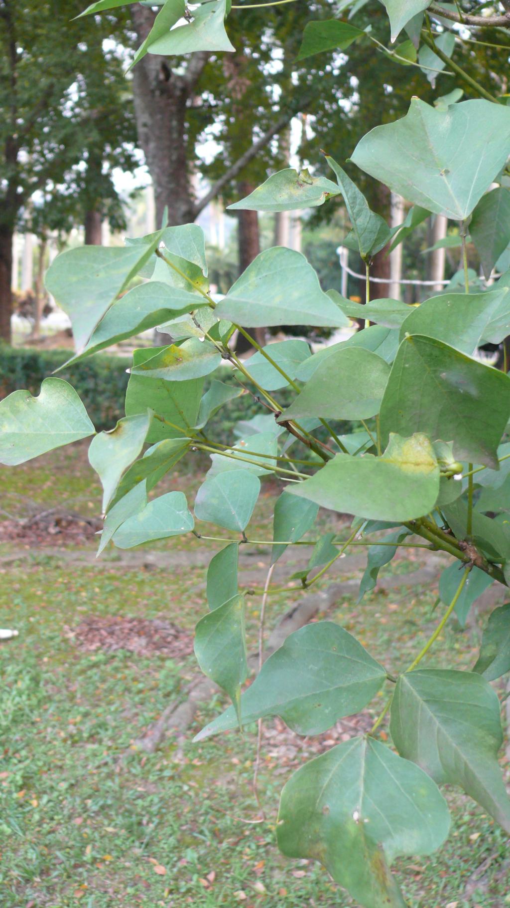 | 型態 | 落葉喬木,高可達30公尺,胸高直徑1公尺,樹皮灰褐色,方塊狀剝落;小枝幼呈黃綠色,被柔毛,老則呈灰褐色,略有皮孔;芽體卵形,長約1公分,略被微毛,鱗狀苞片敷有樹脂,乾後棕黑色,有光澤。單葉,互生,常叢集枝端;葉片薄革質,闊卵形,掌狀3裂,中央裂片較長,先端尾狀漸尖;兩側裂片平展,基部心形,表面綠色,不發亮,背面色稍淡,有短柔毛或老時脫落僅在腋間有毛;邊緣有鋸齒,齒尖腺狀突起。花單性,雌雄同株,無花瓣;雄花序短穗狀,多少排成總狀,雄蕊多而密集,花絲不等長,花藥比花絲略短;花藥卵形,先端圓而凹入,2室,縱裂。種子多數,褐色,多角形或有窄翅。 |